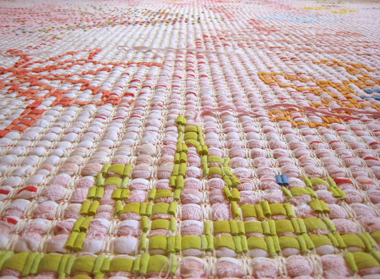 About Recall: My family, grandparents, uncles and aunts have been farmers. During big celebrations the tables were covered with white damask cloth. I wondered about theese stables of white linen – washed, handlet with bluing, hung out along the fields to dry, carefully ironed and sharp folded. Maybe I also felt a little mystified around all that work and caring around the white - and confused around the nearly invisible patterns. When I grew older I discovered that theese innocent linens, if you looked closeley at the detail, could give erotic associations. I have tried to recall the old tradition in a new technique, and I am pleased that the result gives the tapestry a range of readings - from associations to the pleasures of the flesh to something mental or spiritual.